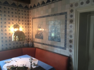 Beim Frühstück in Andresens Gasthof treffen wir einen Mitstreiter, michaelgeocaching aus Köln, der ebenfalls auf dem ZdM unterwegs ist, lassen den gestrigen Tag Revue passieren und gleichen die Bonuszahlen zu Abschnitt 2 ab. Auch die Gaststube bietet einige Besonderheiten; ich habe noch nie einen komplett gefliesten Bartresen gesehen, und auch die Wände sind mit größtenteils handbemalten friesischen Fliesen bekleidet – heute unbezahlbar.