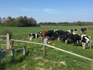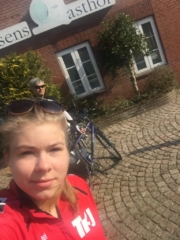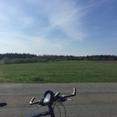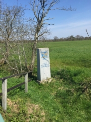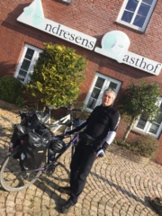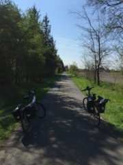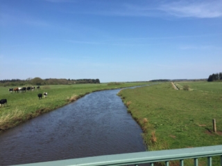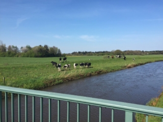 Auch heute wieder lustige Begegnungen am Rande – als wir einem älteren Eingeborenen mit 3 großen Hunden begegnen, ruft er uns im Vorbeifahren zu: „Hebbt i nich ein‘ überseh’n – da hint’n an’n Pfahl?“ (Nein, den hatten wir auch gefunden). Die Anwohner wissen also Bescheid. Wenig später steht an einem Bauernhof ein Hängebauchschwein am Weg und lässt sich ganz zutraulich streicheln. Außerdem stellen wir fest, dass es nicht nur in Belgien, sondern auch in Friesland zweisprachige (deutsch/friesisch) Ortsschilder gibt – und dass die Kühe auch gern mal zum Klönschnack vorbei kommen. Zwischendurch laden immer wieder Bänke zum Pausieren ein, und so vergeht der Tag völlig entspannt. Irgendwo hinter Riesbriek (ZdM 4.27) verlassen wir Nordfriesland und begrüßen meine alte Heimat, den Kreis Schleswig-Flensburg. Die Wege werden immer schmaler, bis wir gegen 16 Uhr planmäßig in Schafflund eintreffen. Hier hat uns die Zivilisation wieder, es gibt Supermärkte, eine Bäckerei, ein Restaurant … und das Storchennest, ein gemütliches Bed & Breakfast in einem Bauernhaus (Anno 1666), unsere heutige Unterkunft.